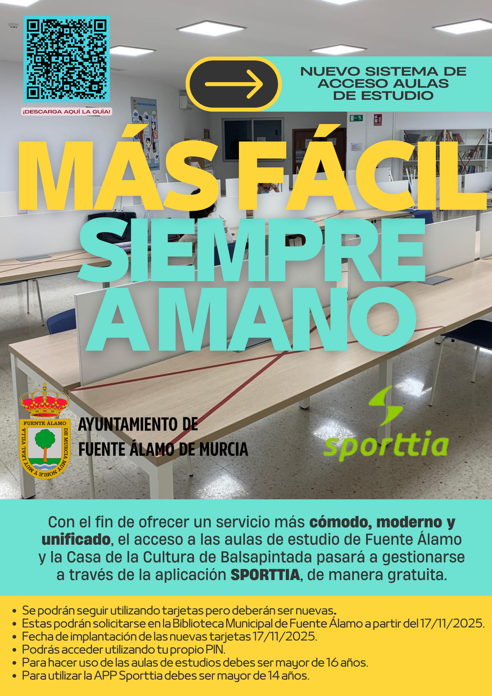 La fecha de implantación será el 17/11/25, y durante esa semana se podrán realizar las nuevas tarjetas en la Biblioteca de Fuente Álamo, en su horario habitual.