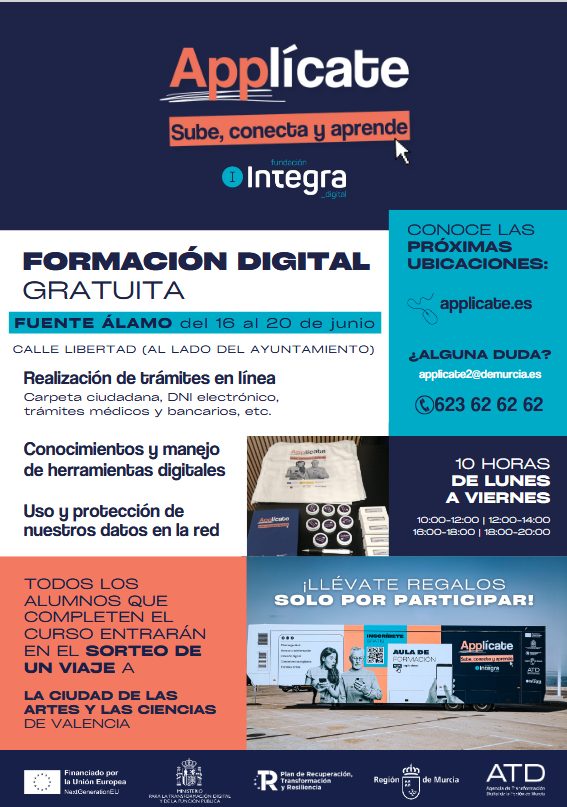 Del 16 al 20 de junio, Fuente Álamo acogerá el Aula Móvil del proyecto “Applícate: sube, conecta y aprende”, una iniciativa de la Fundación Integra Digital destinada a mejorar las competencias digitales de la ciudadanía a través de cursos gratuitos y adaptados a diferentes perfiles.