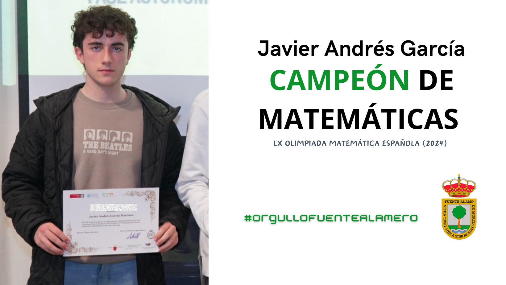 Una vez más hacemos uso del hashtag #orgullofuentealamero: Javier Andrés García, vecino de la pedanía de Los Cánovas; es proclamado Campeón Regional de Matemáticas de la «LX Olimpiada Matemática Española»