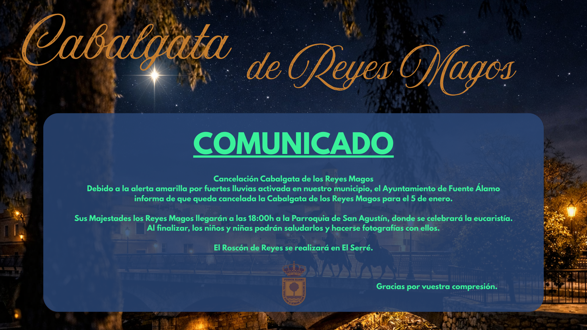 Debido a la alerta amarilla por fuertes lluvias activada en nuestro municipio, el Ayuntamiento de Fuente Álamo de Murcia informa de que queda cancelada la Cabalgata de los Reyes Magos prevista para el 5 de enero.