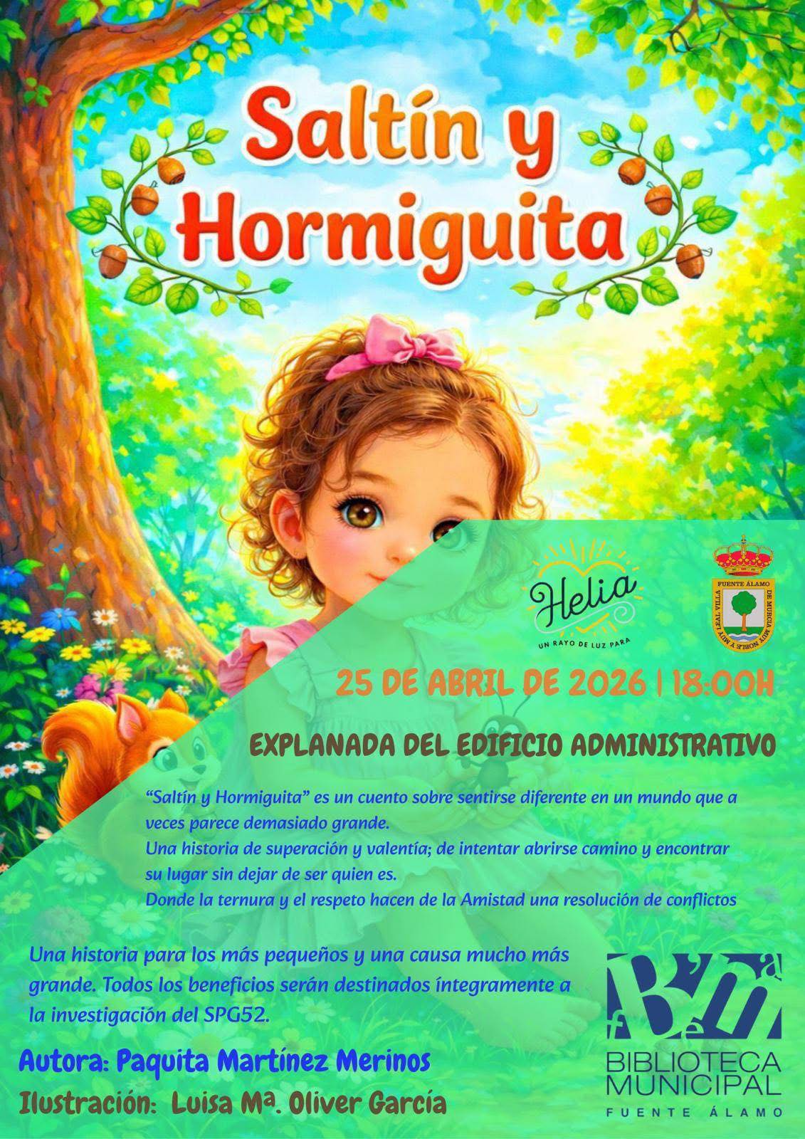 “Saltín y Hormiguita” es una historia que habla de superación, respeto y valentía, dirigida especialmente a los más pequeños, pero con un mensaje universal sobre la importancia de aceptarse y encontrar el propio lugar en el mundo. Todos los beneficios obtenidos se destinarán íntegramente a la investigación del SPG52, convirtiendo este evento en una oportunidad para unir cultura y solidaridad en apoyo a Helia y su familia.